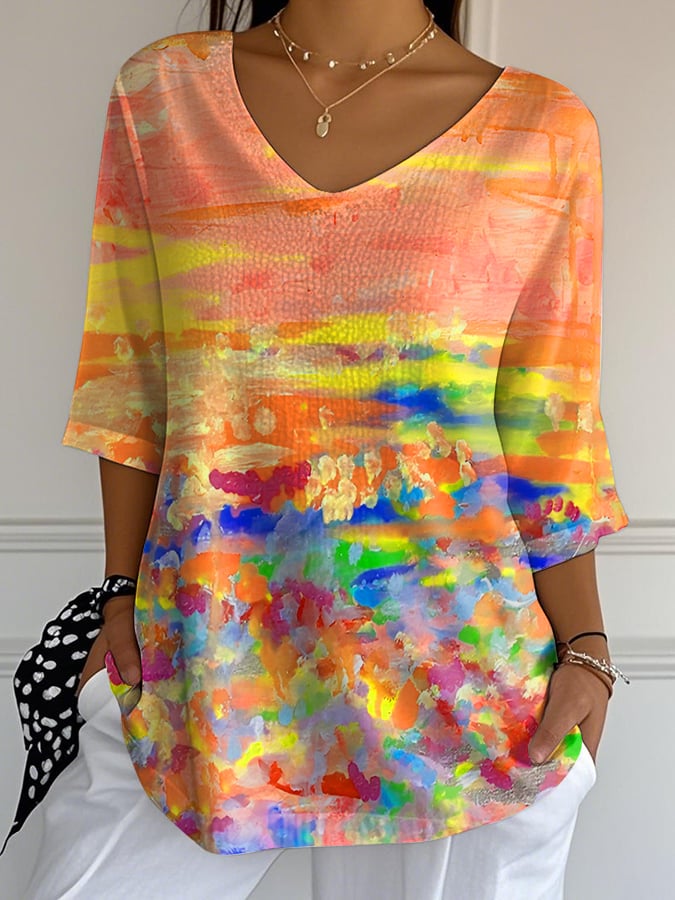 Women's Casual Autumn Oil Painting Bubble Wrinkle Cotton And Linen Top