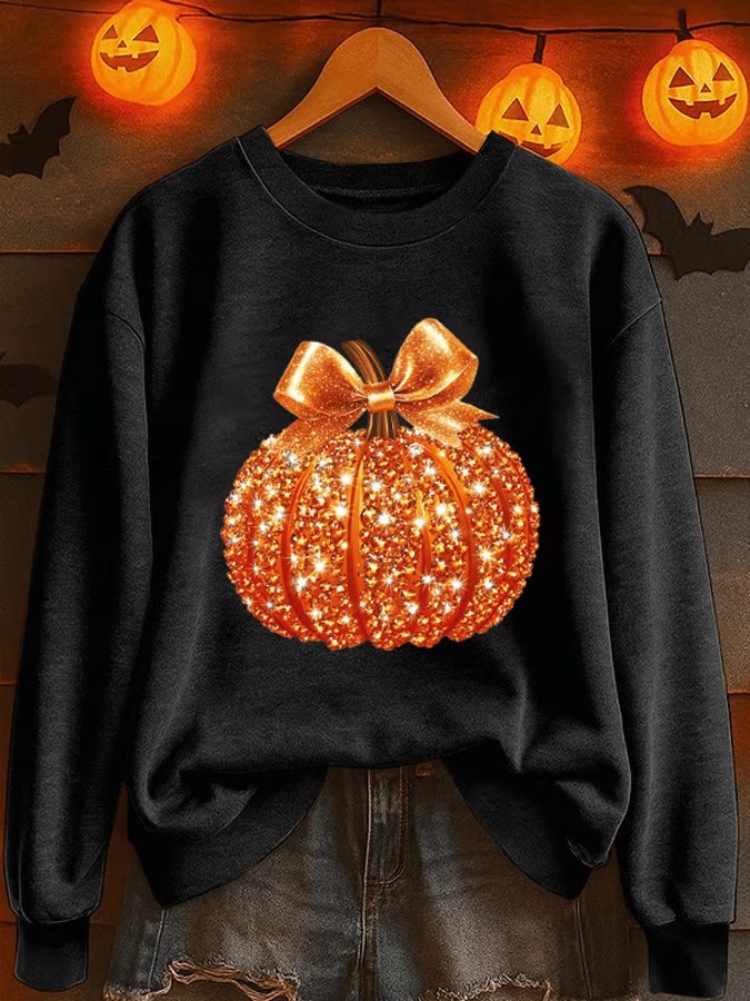 Women's Sequin Pumpkin Print Crew Neck Sweatshirt